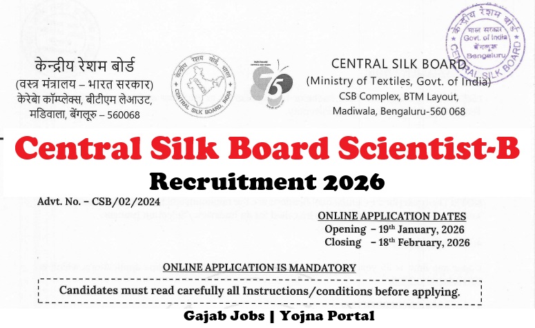 CSB Recruitment 2026: अगर आप टेक्सटाइल या सिल्क टेक्नोलॉजी क्षेत्र में सरकारी नौकरी की तलाश कर रहे हैं, तो आपके लिए एक बेहतरीन अवसर सामने आया है। Central Silk Board (CSB) ने वर्ष 2026 के लिए Project Assistant पद पर भर्ती का आधिकारिक नोटिफिकेशन जारी किया है। यह भर्ती बेंगलुरु – कर्नाटक में की जाएगी और इच्छुक उम्मीदवारों को 25 फरवरी 2026 को वॉक-इन इंटरव्यू में भाग लेना होगा। सेंट्रल सिल्क बोर्ड, भारत सरकार के वस्त्र मंत्रालय (Ministry of Textiles) के अंतर्गत कार्य करता है और देश में रेशम उद्योग के विकास, अनुसंधान और तकनीकी उन्नति में महत्वपूर्ण भूमिका निभाता है। ऐसे में इस संस्थान में कार्य करना न केवल सम्मानजनक है बल्कि करियर के लिहाज से भी एक अच्छा अवसर है।