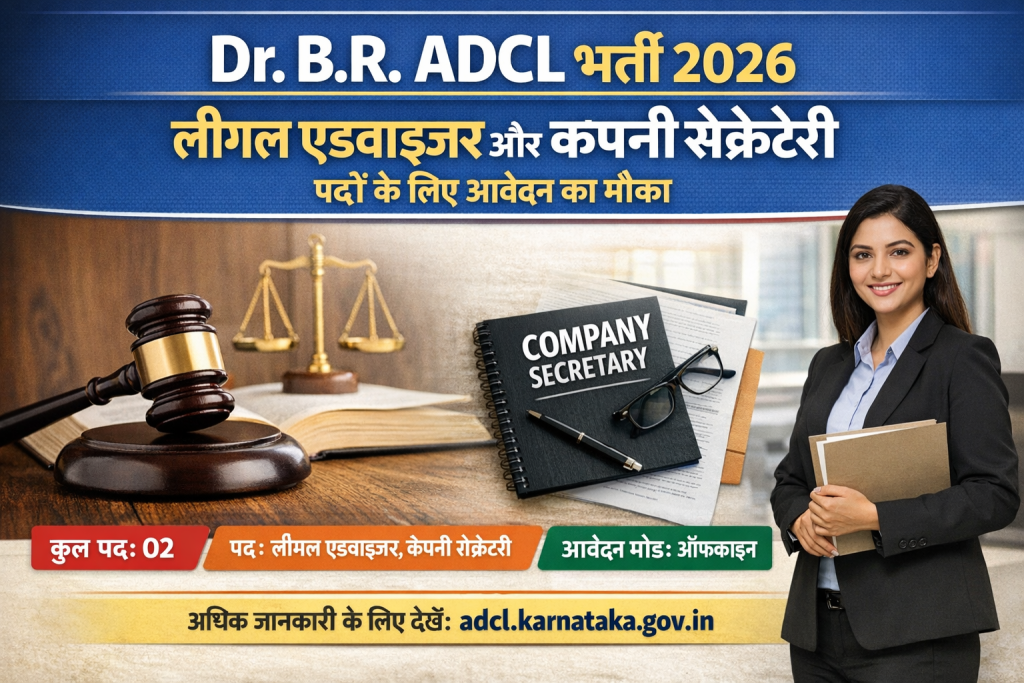 Dr. B.R. ADCL भर्ती 2026: Dr. B.R. Ambedkar Development Corporation Limited (Dr. B.R. ADCL) Recruitment 2026 के तहत योग्य उम्मीदवारों के लिए एक शानदार अवसर सामने आया है। इस भर्ती अभियान के माध्यम से लीगल एडवाइजर और कंपनी सेक्रेटरी के कुल 2 पदों को भरा जाएगा। खास बात यह है कि इस भर्ती के लिए आवेदन प्रक्रिया ऑफलाइन मोड में रखी गई है, जिससे इच्छुक अभ्यर्थियों को निर्धारित प्रारूप में आवेदन पत्र भेजना होगा।