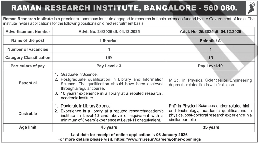 RRI भर्ती 2026 के लिए आवेदन करने वाले उम्मीदवारों के पास संबंधित क्षेत्र में मान्यता प्राप्त विश्वविद्यालय या संस्थान से उपयुक्त शैक्षणिक योग्यता होनी चाहिए।