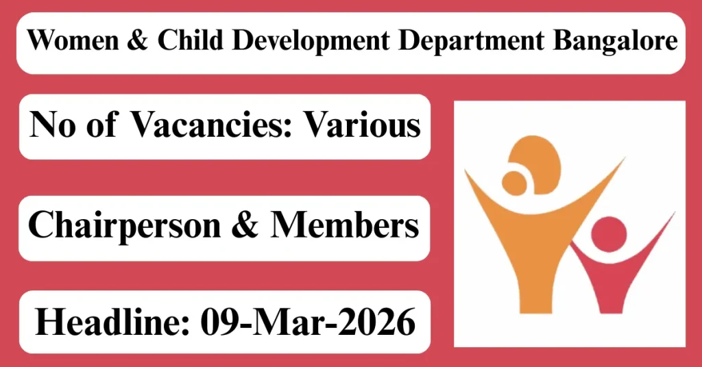 WCD Bangalore Recruitment 2026: सरकारी क्षेत्र में सामाजिक सेवा और प्रशासनिक भूमिका निभाने की इच्छा रखने वाले उम्मीदवारों के लिए एक बेहतरीन अवसर सामने आया है। महिला एवं बाल विकास विभाग, बेंगलुरु (WCD Bangalore) ने वर्ष 2026 के लिए Chairperson और Members पदों पर भर्ती का आधिकारिक नोटिफिकेशन जारी कर दिया है। यह भर्ती खास तौर पर उन अनुभवी उम्मीदवारों के लिए है जो महिला एवं बाल अधिकारों के क्षेत्र में काम करने का अनुभव रखते हैं। इस भर्ती के तहत इच्छुक और योग्य उम्मीदवार ऑफलाइन आवेदन कर सकते हैं। आवेदन प्रक्रिया शुरू हो चुकी है और आवेदन की अंतिम तिथि 09 मार्च 2026 तय की गई है। जो अभ्यर्थी कर्नाटक सरकार के अंतर्गत बेंगलुरु में कार्य करना चाहते हैं, उनके लिए यह एक सम्मानजनक और जिम्मेदारी भरा पद है।